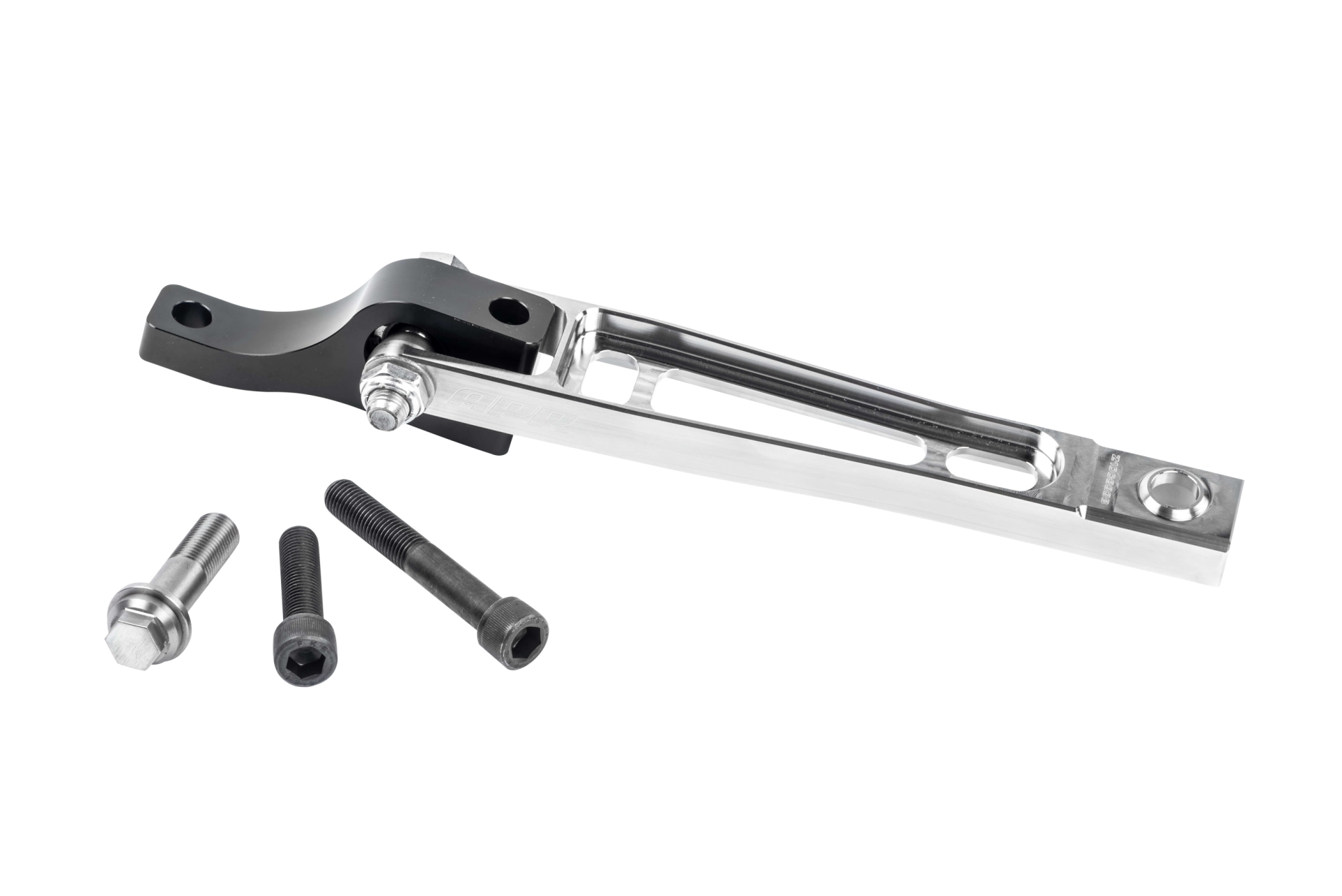 Die APR Pendelstütze ersetzt die werksseitig verbaute Halterung durch eine neue, hochfeste und aus zwei Teilen bestehende Aluminium-Edelstahl Stütze mit gefüttertem Teflon-Kugellager und neuen Schrauben.