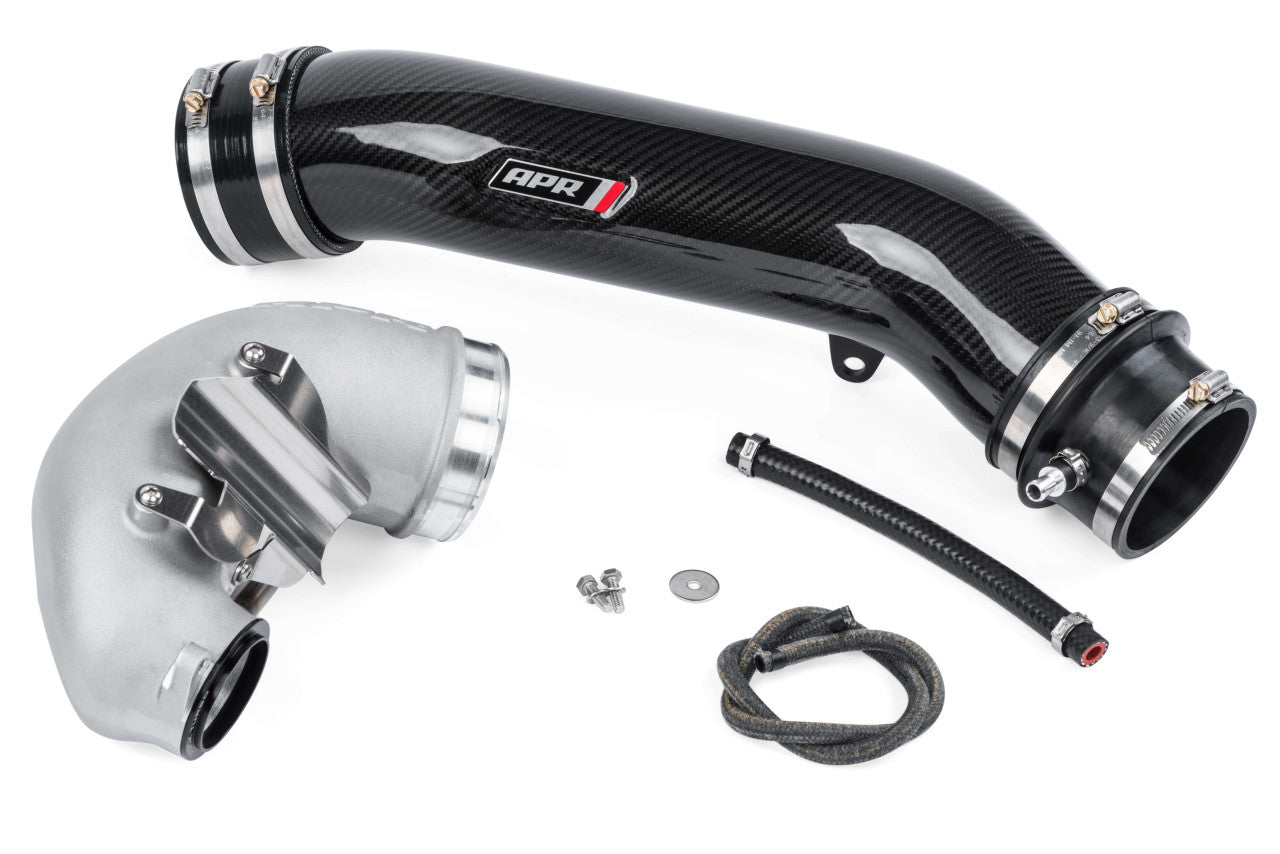 Das APR Turbo Inlet besteht aus einem massiven 4 Zoll (101,6 mm) Carbon-Einlassrohr, welches an den originalen Luftfilterkasten, oder das kommende APR Air Intake angeschlossen wird. Nach dem wunderschönen Carbon-Rohr folgt das hochwertige, ebenfalls 4 Zoll (101,6 mm) große Aluminium-Guss Turbo Inlet, welches organisch konstruiert ist, um den größtmöglichen Querschnitt innerhalb des Rohrs bis zum Einlass des Turboladers beizubehalten. Trotz der visuell extravaganten Form, ist die Aufrechterhaltung der Querschnittsfläche, der Schlüssel zum Leistungsplus.