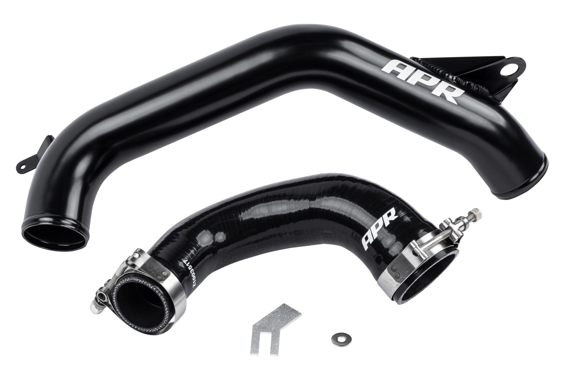 Die serienmäßige Kunststoff-Gummi Turbo Outlet Pipe ist ein kleines, restriktives 38 Millimeter Rohr, welches unter extremen Bedinungen anfängt zu schmelzen, sich zu verformen und ggf. zu einem Ladedruck-Leck wird. Durch das Wechseln auf eine 60 Millimeter Aluminium-Pipe, zusammen mit einem neuen mehrlagigen Fluor-Silikon Schlauch tritt dieses Problem nicht mehr auf. Die speziell bearbeiteten Enden der Schläuche sorgen für einen einwandfreien Übergang zum Aluminiumrohr und die ebenfalls mitgelieferten T-Bolzen-Schellen sorgen für eine starke und lecksichere Abdichtung am Rohr. Alle Pipes sind WIG-geschweißt, 100% passgenau und schwarz beschichtet. Eine kleine überstehende Lippe jeweils am Ende der Pipe verhindern zusätzlich ein Verrutschen selbst unter extremsten Ansprüchen. Alle Teile passen auf den OEM Turbolader und dem APR oder OEM Ladeluftkühlerschlauch.