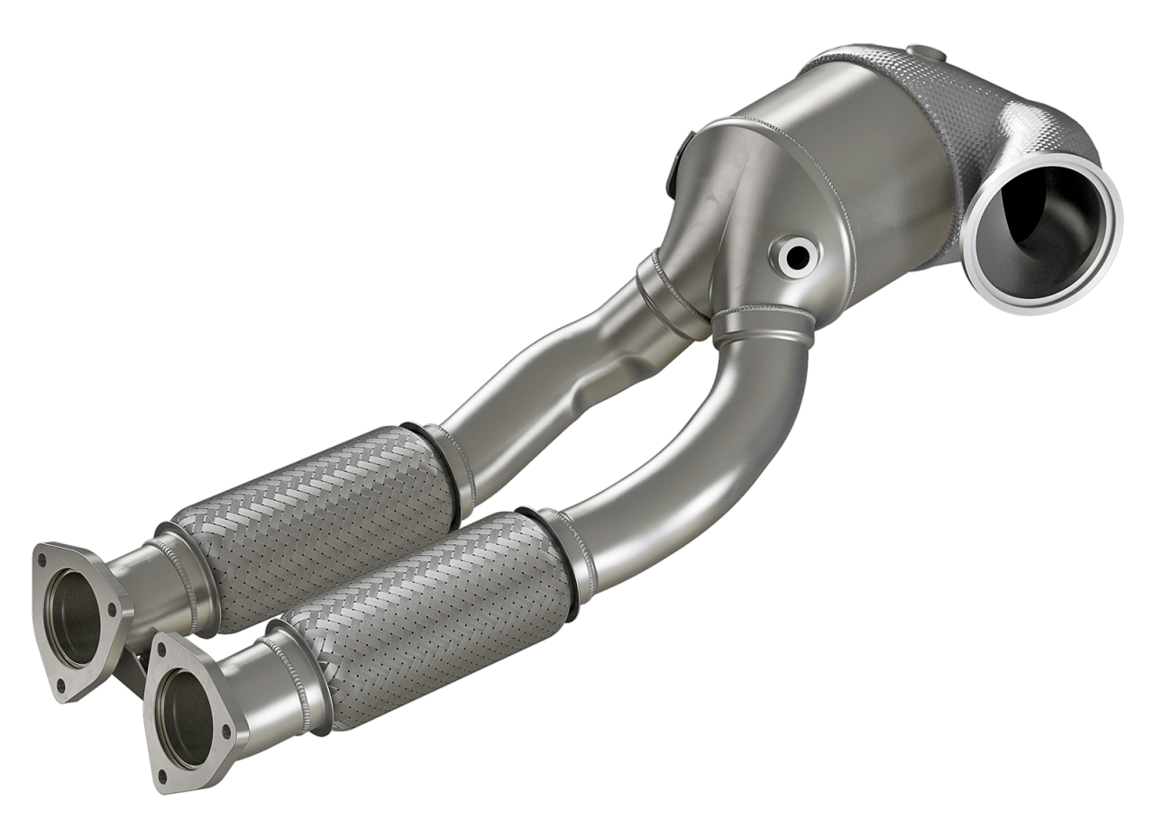 Diese hochwertig verarbeitete HJS Edelstahl Downpipe von hat einen Durchmesser von 96mm am Turbo und geht dann in 2x 2,5" über. Der Rennkat ist ein 200 Zellen Metallkat welcher nochmals den Abgasgegendruck deutlich reduziert.