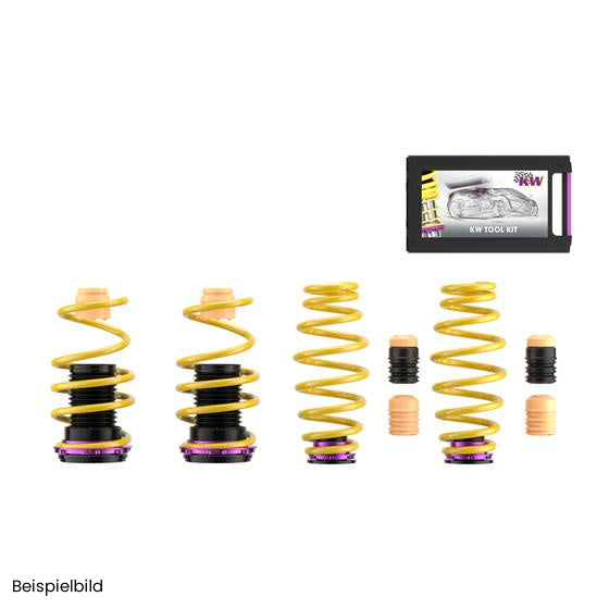Die KW Gewindefedern werden zur Tieferlegung des Fahrzeugs in Kombination mit den serienmäßigen Dämpfern verwendet. Im Gegensatz zu herkömmlichen Federsätzen ist eine individuelle Höhenanpassung innerhalb des geprüften Einstellbereichs möglich. Bei dieser Lösung kommen fahrzeugspezifische Federaufnahmen mit abgestimmten KW Tieferlegungsfedern und passenden Elastomeren sowie Staubschutzsystemen zum Einsatz. Das serienmäßige Dämpfersystem zum Beispiel mit elektronischer oder hydraulischer Regelung bleibt weiterhin aktiv.