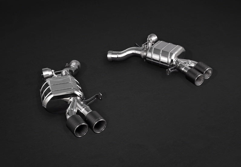 Sportauspuff BMW M5 (F10) Capristo mit Abgasklappen, 1.4828 Edelstahl poliert, mit Unterdruckadapter und programmierbarer Klappensteuerung CES-3, optimierte Version mit 80er Rohr für besten Sound und maximale Performance, MSD-Ersatz, Edelstahl/Carbon-Endrohre.