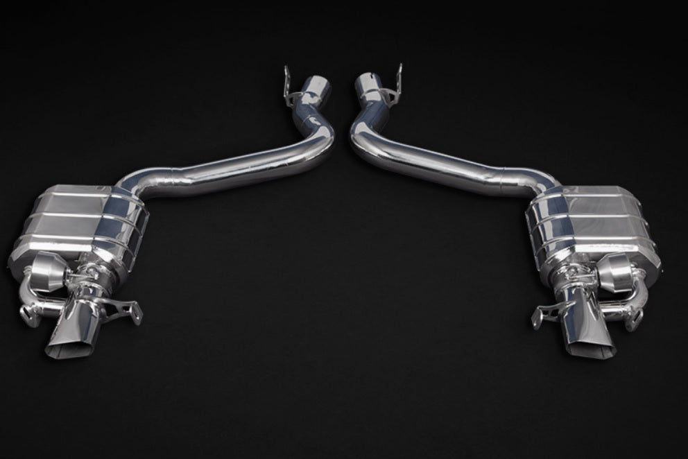 Sportauspuff Mercedes GT63 GTS63 AMG Capristo Edelstahl poliert, mit 2 Klappen incl. programmierbarer Steuerung CES-3, zwei Handsender, Anschlusskabel und Schläuche